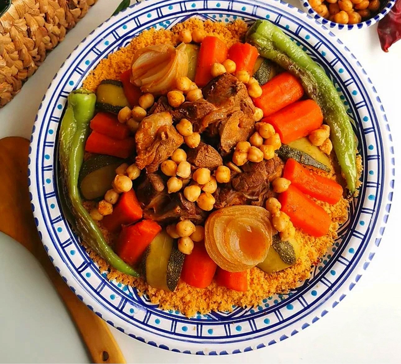 Steamed semolina grains served with a fragrant tomato based stew containing a multitude of slow-cooked vegetables like carrots, zucchini, and all infused with traditional north african spices, finally topped with spiced browned onions and chickpeas.